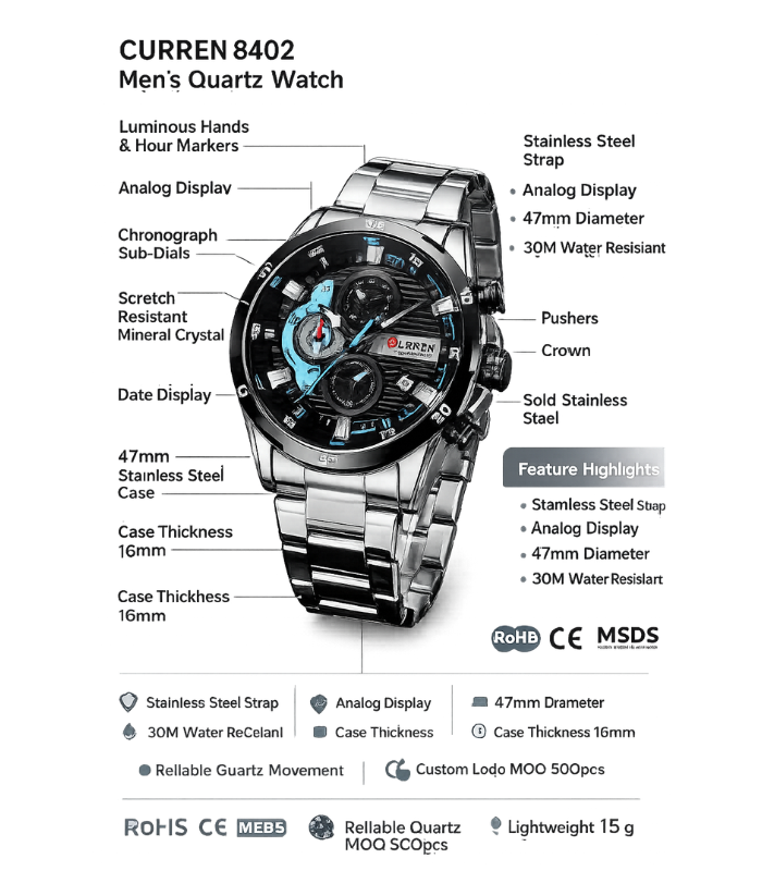 Curren 8402 Watch Silver Black for Men